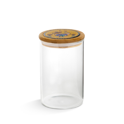 Tampa de madeira com aplicação de cerâmica e vedação interna que garante o frescor do seu conteúdo.
