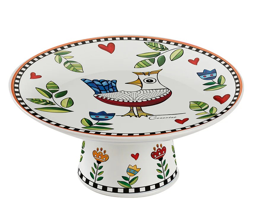 O Suporte para Bolos "Cocoricò Amarelo é um exemplo refinado de como a funcionalidade pode se encontrar com a estética de uma forma lúdica e cativante. Ele é decorado com um design vibrante que representa pássaros estilizados em um jogo de formas e cores quentes, sobre um fundo que realça o brilho e a vivacidade do laranja. Perfeito para expor sobremesas, frutas ou servir aperitivos com elegância.
