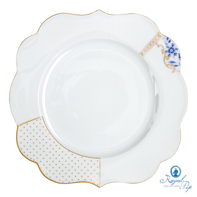 O prato de jantar Royal White da Pip Studio tem um acabamento em ouro nas bordas, estas desenhadas com um formato único e especial. Sua estampa de flores dá um toque delicado e leve à peça.