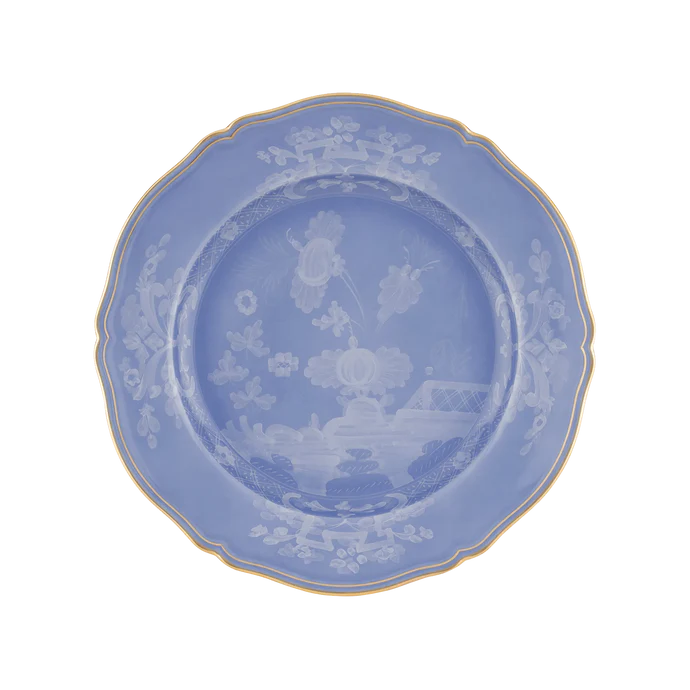 Prato de jantar confeccionado em porcelana da mais alta qualidade com detalhes dourados. O formato Antico Doccia, ícone histórico da Manufatura Florentina, confere linhas harmoniosas e sofisticadas. O azul-pervinca anima o design, e o célebre motivo floral em tom sobre tom, com cravos, confere autêntica originalidade. Oriente Italiano é uma homenagem às atmosferas mágicas do Oriente, recriadas graças à habilidade e atenção aos detalhes dos artesãos Ginori 1735.