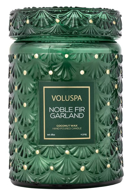 O vidro em relevo Art Déco da Noble Fir Garland captura os tons verde-azulados do Abeto Nobre. O vidro é elegantemente adornado com ornamentos dourados pintados a mão, simulando uma clássica árvore de Natal. A embalagem externa espelha a estampa Art Déco em verde monocromático, finalizada com detalhes metálicos dourados.